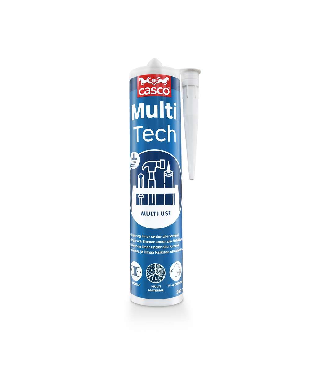 PRODUKTBESKRIVNING Casco® MultiTech ett en-komponent allround lim och fogmassa med brett användningsområde och god vidhäftning mot de flesta underlag. ANVÄNDNING Casco® MultiTech kan användas för fogning, tätning nåtning samt limning och fyllning i eller runt: ▪ Golv ▪ Väggar ▪ Dörrar ▪ Fönster ▪ Tak ▪ Våtrum ▪ Kök ▪ Tvättstuga Casco® MultiTech kan användas på många olika underlag. Casco® MultiTech kan användas som lim och fog och nåtning på fritidsbåtar. Casco® MultiTech kan användas både inom- och utomhus.
